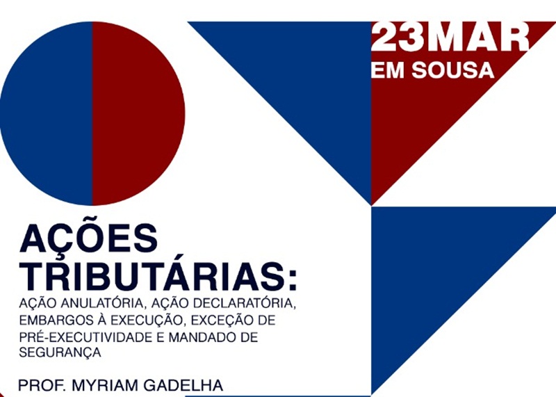 Nesse dia 23 (Sexta-feira), excepcionalmente, em Sousa, ocorrerá o curso de Ações Tributárias, abrangendo as áreas de: Ação Anulatória, Ação Declaratória, Embargos à Execução, Exceção de Pré-executividade e Mandado de Segurança.
