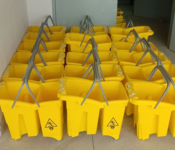 Cada kit será composto pelos seguintes itens: Mop de algodão para serviços úmidos; Balde/carrinho com prensa de torção; Placa de sinalização “Piso Molhado”; Pá coletora 4l com cabo de alumínio; Suporte para mop úmido; Refil para mop úmido; Vassoura 60cm; Luvas de borracha.