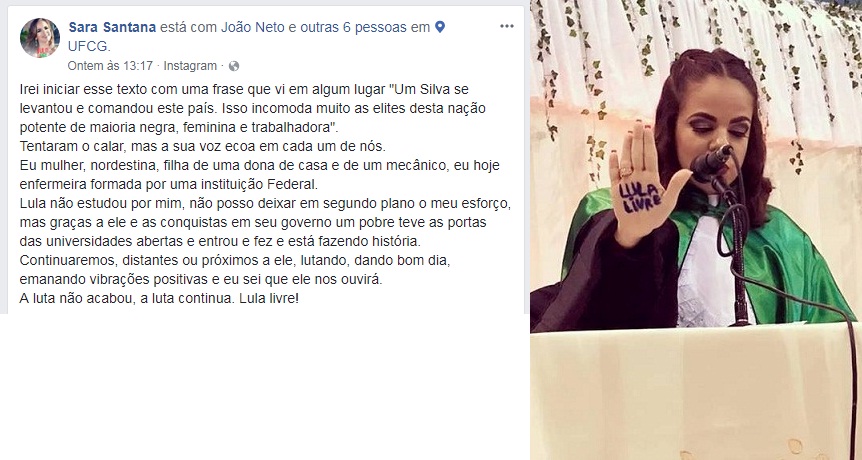 A cajazeirense Sara Santana, 24 anos, aproveitou a cerimônia de colação de grau em que ela se formou em Enfermagem pela UFCG, campus de Cajazeiras, para agradecer ao ex-presidente Lula e protestar contra sua prisão.