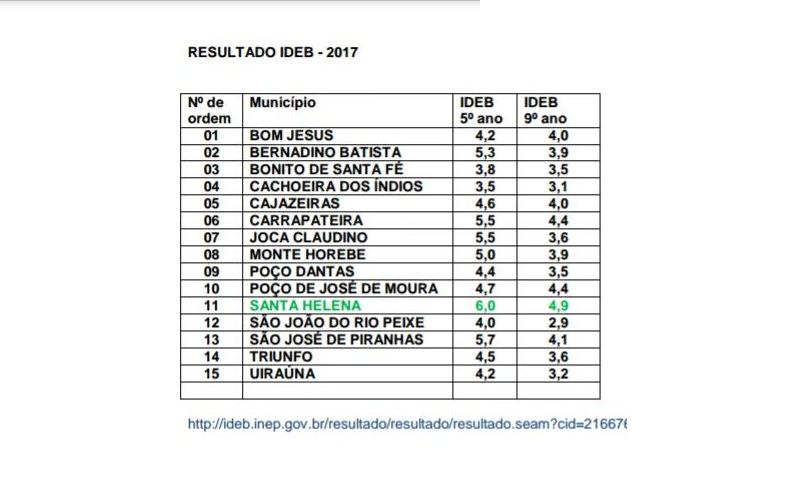 No mais recente relatório emitido pelo Ministério da Educação (MEC), Santa Helena aparece com Ideb de 6,0 no Ensino Fundamental I, liderando a lista dos 15 municípios da região. Em segundo lugar está São José de Piranhas, com 5,7.
