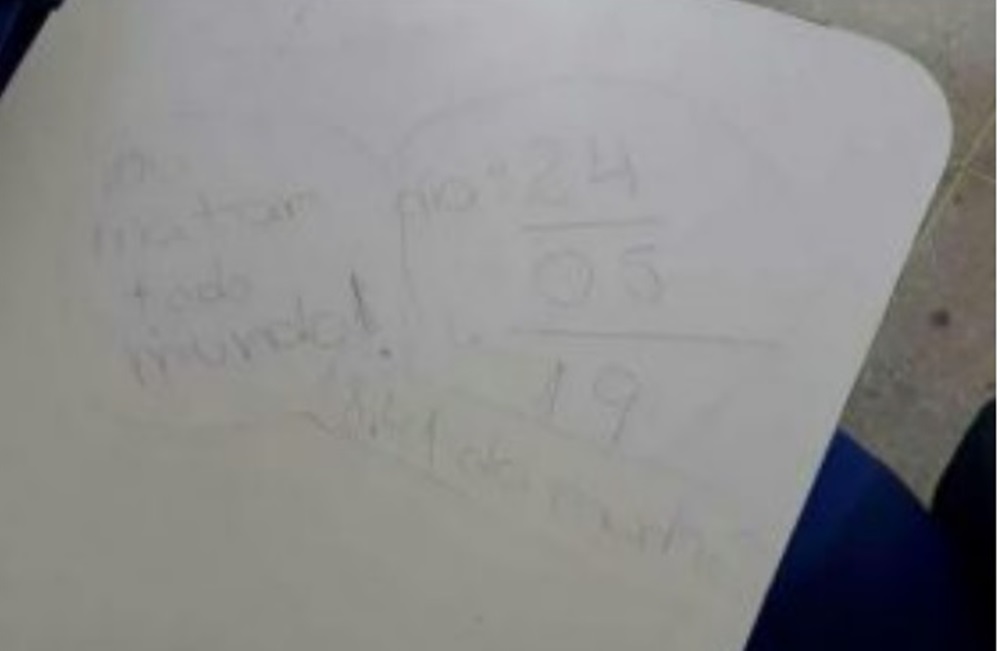 O recado foi deixado nessa sexta-feira (10), com o seguinte conteúdo: “Eu vou matar todo mundo”, e ainda marcou a data para o suposto atentado, que seria 24 de maio às 08h41min.