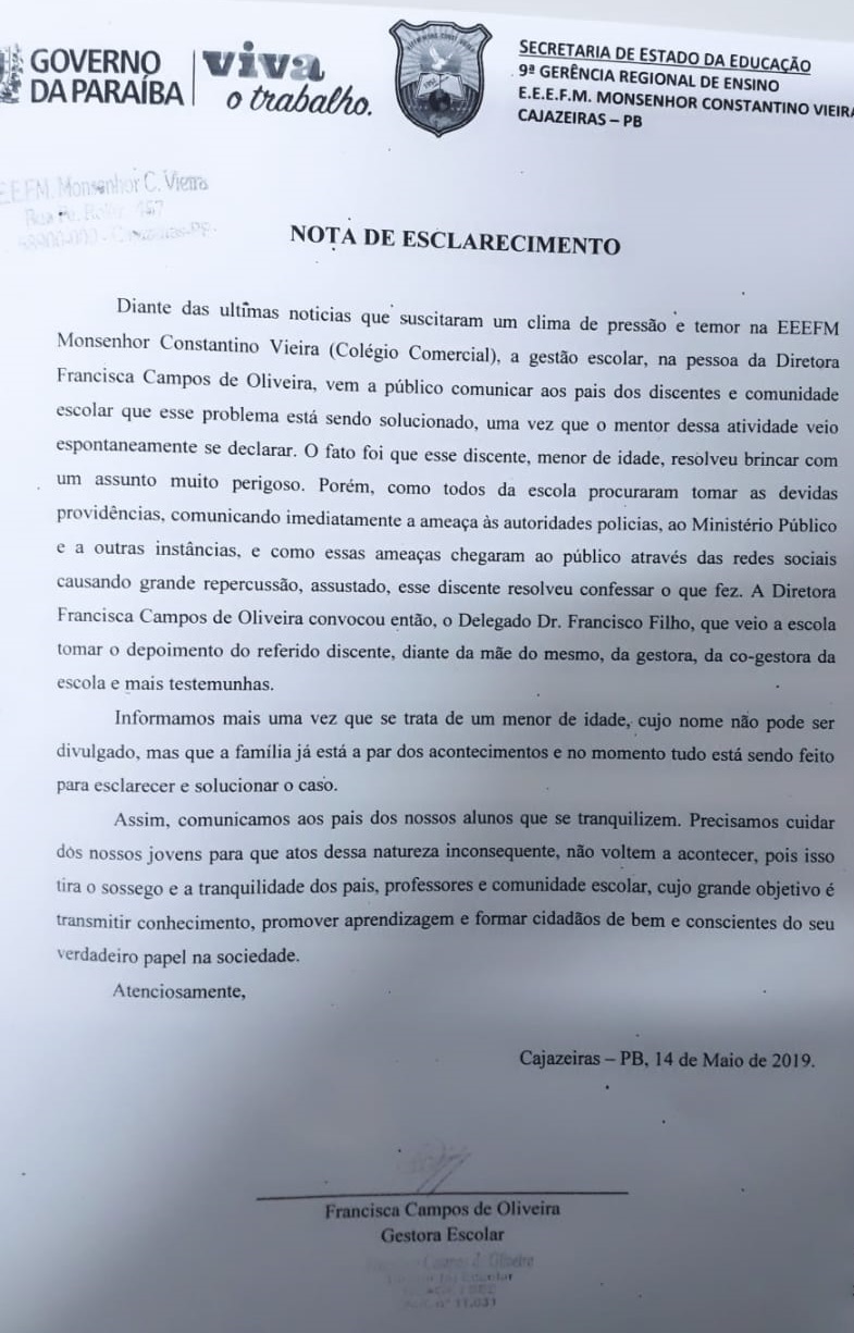 A diretora Francisca Campos emitiu uma nota nessa terça-feira (14), e disse que a gestão escolar está sofrendo pressão devido a repercussão do caso. Campos revelou que o “mentor” da ameaça, um menor, se apresentou espontaneamente a direção e teria afirmado que tudo não passou de uma brincadeira.