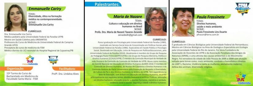 Palestrantes são a médica e professora Emmanuelle Cariry, com o tema “Diversidade, ética na formação médica na contemporaneidade”; a professora e psicóloga Maria de Nazaré, com o tema “Cultura e educação em direitos humanos no Brasil”; e a professora e bióloga Paula Frassinete, com o tema “Direitos humanos, saúde e meio ambiente”.