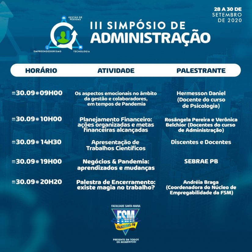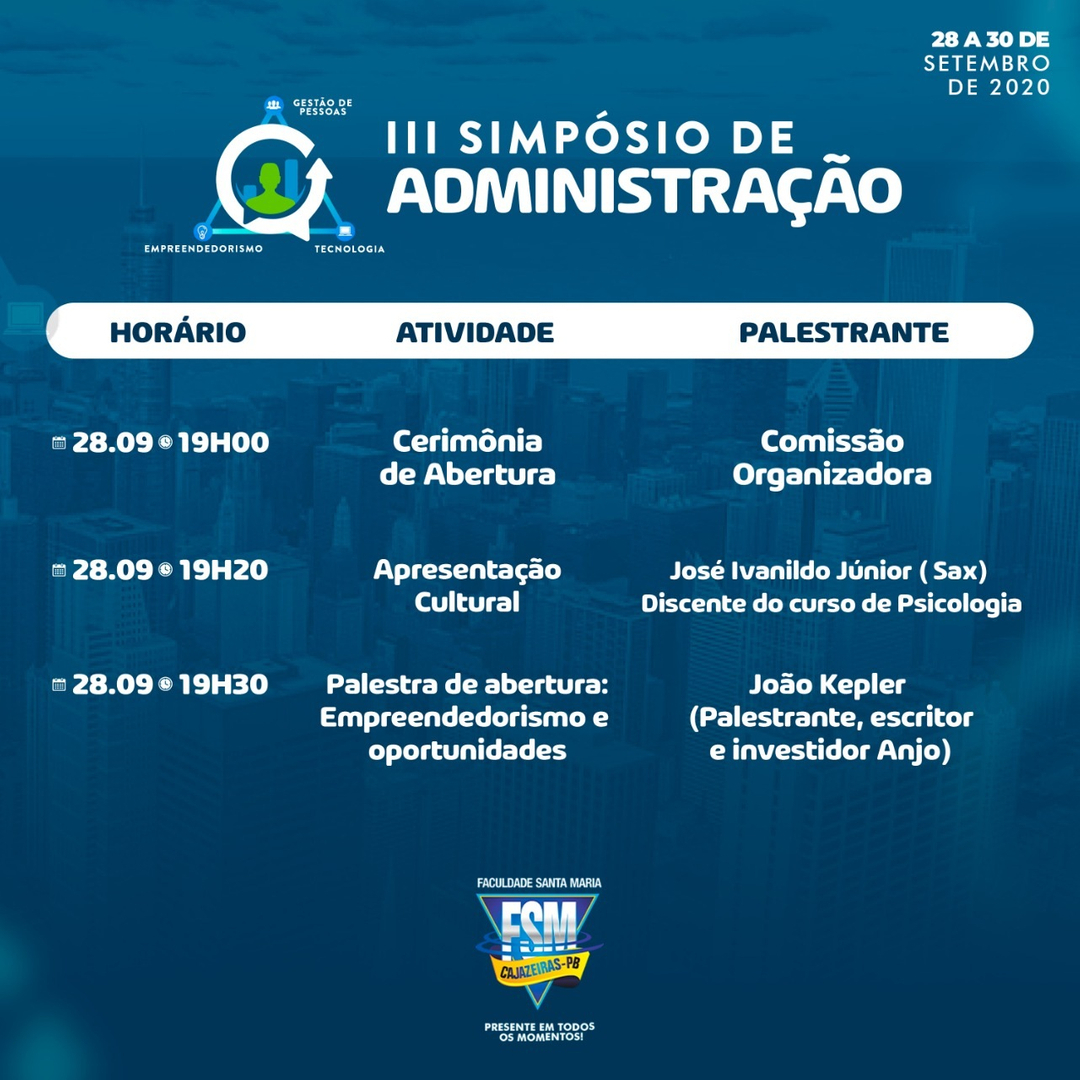 O III Simpósio de Administração da FSM, acontecerá no período de 28 a 30 de setembro de forma remota, tendo como objetivo oferecer aos docentes e discentes da Santa Maria e de outras instituições públicas e privadas, bem como aos empresários e convidados, espaços de partilha da produção científica, estimulando debates que contribuam para a articulação entre ensino, pesquisa e vivência prática nas atividades empresariais.