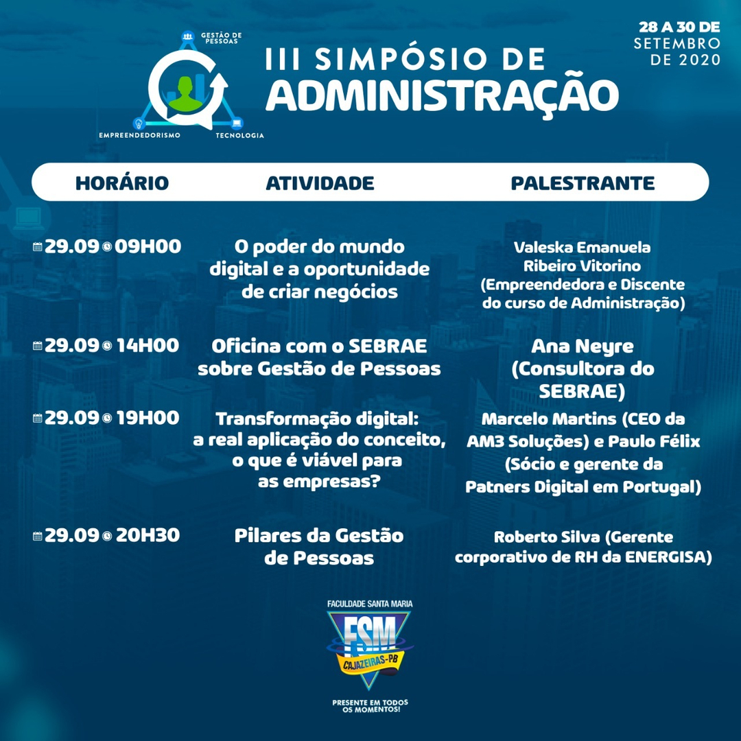 O curso de Administração da Faculdade Santa Maria realiza, de 28 a 30 deste mês, o III Simpósio de Administração da FSM, com o tema “Tecnologia, Gestão de Pessoas e Empreendedorismo – Desafios e Potencialidades em um Novo Mundo”.