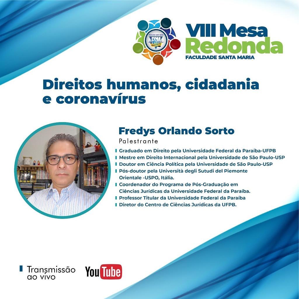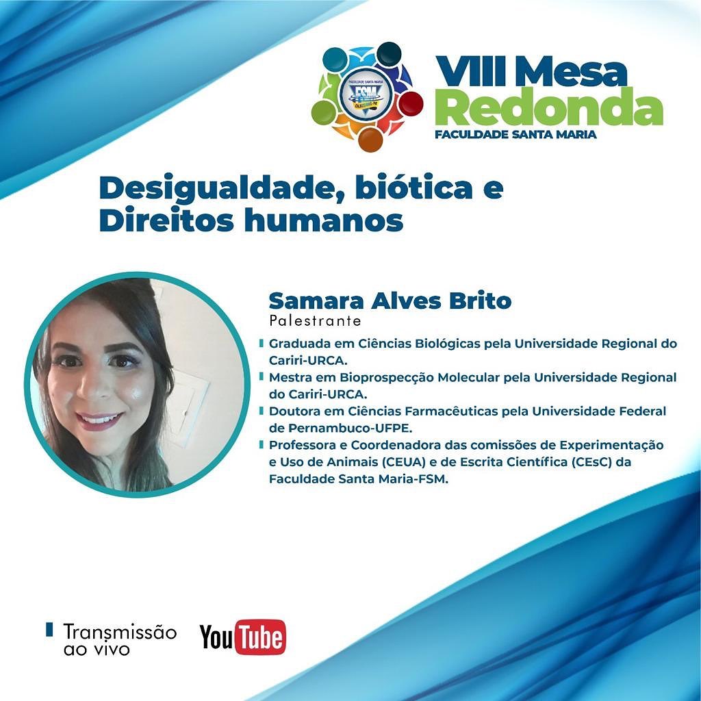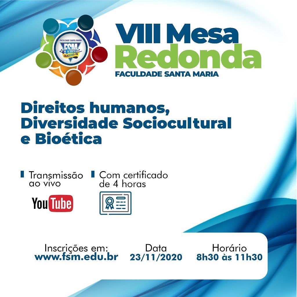 A Faculdade Santa Maria, da cidade de Cajazeiras, no Sertão do paraibano, realizará na segunda-feira (23) a VIII Mesa Redonda, que tem como tema “Direitos Humanos, Diversidade Sociocultural e Bioética”. O debate tem a orientação da professora doutora Lindalva Cruz e está sendo organizado pelos alunos do 1º Período do curso de Medicina (Turma 2020.2). O evento será realizado de forma online e transmitido pelo canal da Faculdade Santa Maria no YouTube das 08h30 às 11h30.