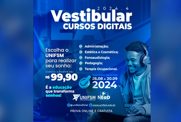 O Centro Universitário Santa Maria (UNIFSM) deu início às inscrições para o Vestibular dos Cursos Digitais-EaD 2024.4, que se estendem até 30 de setembro.