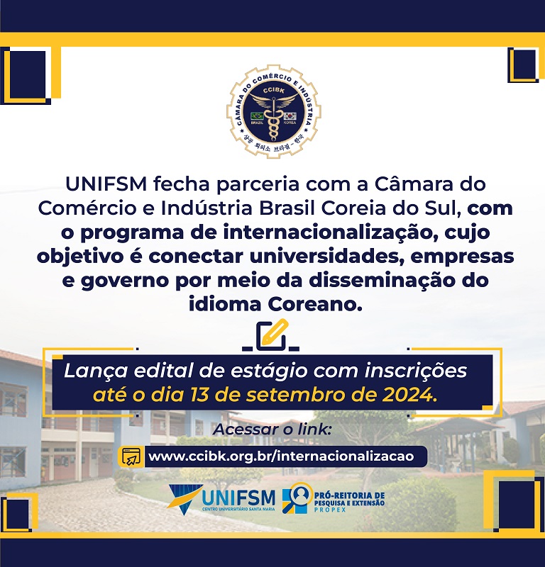 Como parte desta iniciativa, o UNIFSM lança o Edital de estágio, oferecendo aos alunos a oportunidade de se candidatarem para vagas em empresas e instituições parceiras na Coreia do Sul. As inscrições para o processo seletivo estão abertas até o dia 13 de setembro de 2024.
