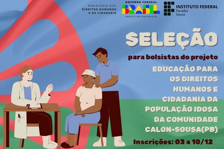 A Direção-geral do Campus Sousa do IFPB publicou no último dia 28, um edital de seleção de estudantes e profissionais interessados em desempenhar as funções de Supervisor Comunitário, Apoio Administrativo, Professor, Monitor e Monitor Comunitário junto ao projeto “Educação para os Direitos Humanos e Cidadania da População Idosa da Comunidade Calon – Sousa / PB”. A ação é fruto de uma parceria entre o campus, o Ministério dos Direitos Humanos e da Cidadania (MDHC) e a Fundação de Educação Tecnológica e Cultural da Paraíba (Funetec-PB) com o objetivo de desenvolver a formação política em Direitos Humanos de pessoas idosas que fazem parte da comunidade cigana Calon.