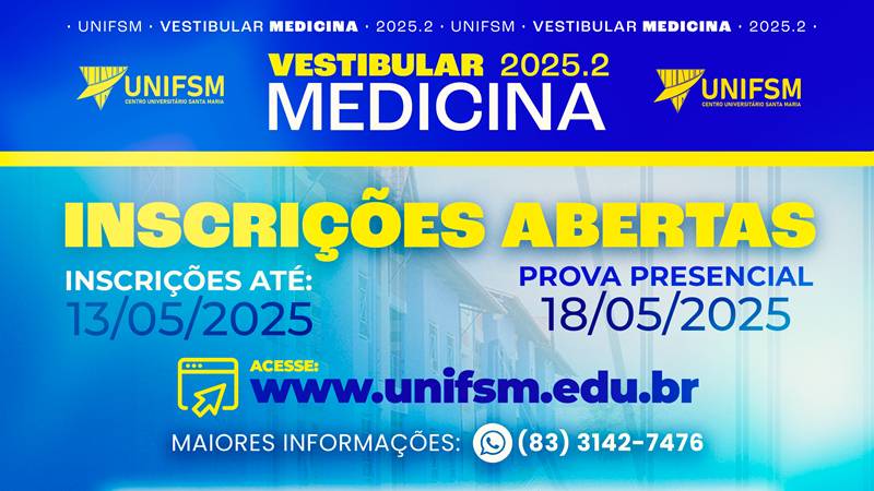 O Centro Universitário Santa Maria (UNIFSM) abriu, nesta segunda-feira (10), as inscrições para o vestibular de Medicina 2025.2. Os candidatos têm até o dia 13 de maio de 2025 para se inscrever através do site oficial da instituição: unifsm.edu.br. A prova será realizada, de forma presencial, no dia 18 de maio, em Cajazeiras-PB.