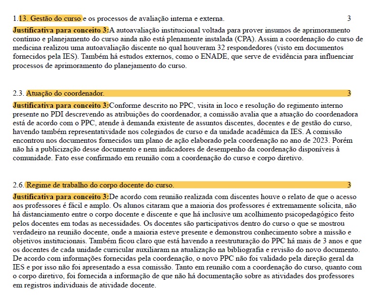 A médica e professora apresentou relatório da avaliação do MEC que comprova que o curso recebeu três notas 3 em quesitos referentes à coordenação, e ela voltou a relacionar essas notas com o conceito final contínuo do curso, que foi de 4,41