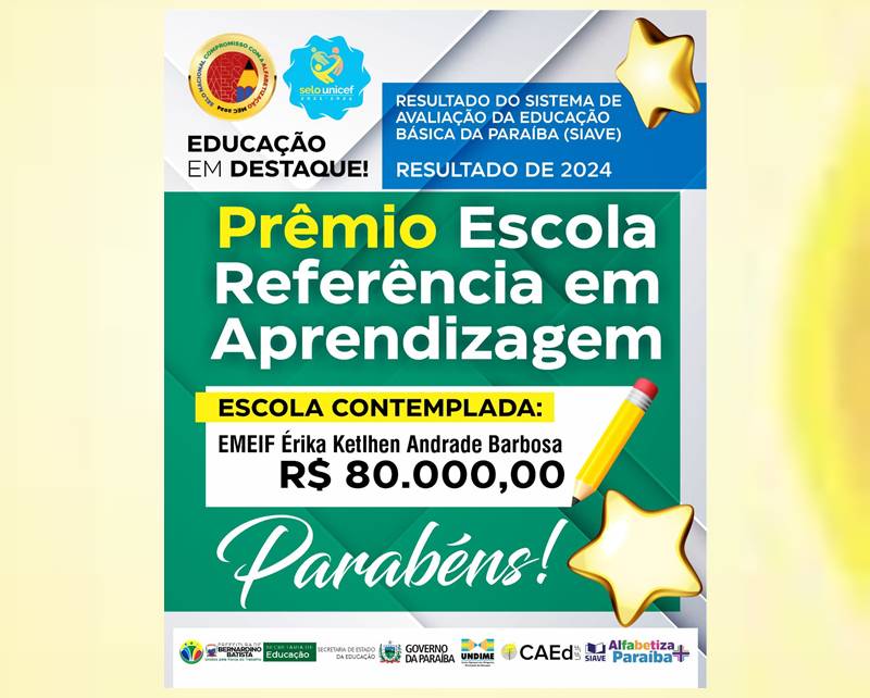 A honraria integra o Programa Alfabetiza Mais Paraíba, que reconhece escolas e municípios que se destacam no compromisso com a alfabetização das crianças na idade certa. No município, a grande vencedora foi a EMEIF Érika Kethlen Andrade Barbosa, que se destacou pelos excelentes resultados no Sistema de Avaliação da Educação Básica da Paraíba (Siave) no último ano de 2024.