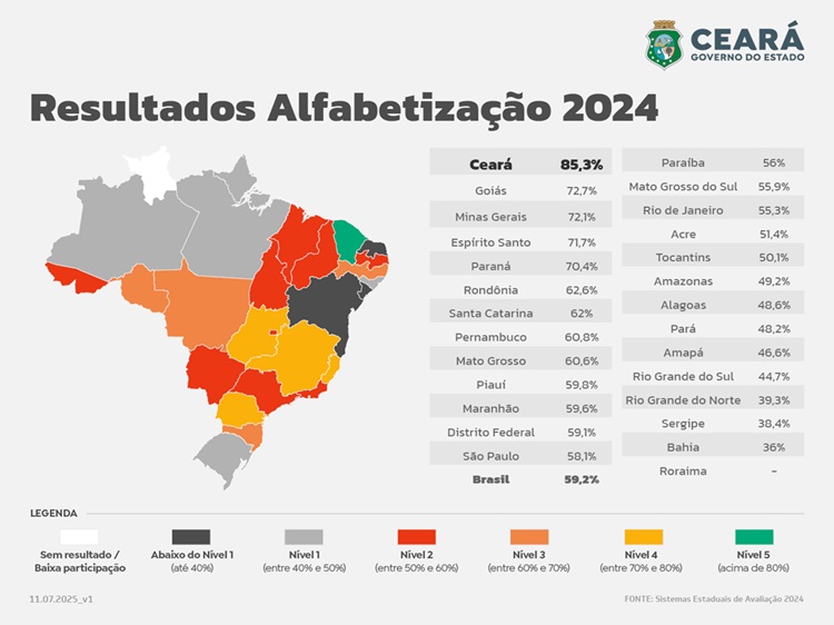 Dados – Dados do Indicador Criança Alfabetizada (ICA) divulgados pelo Ministério da Educação (MEC) na última sexta-feira (11) em Brasília mostram que, no Brasil, 59,2% das crianças alcançaram o nível adequado de alfabetização em 2024, superando os 56% de 2023, mas ainda abaixo da meta nacional de 60%. Nesse cenário, o Ceará segue como exemplo de superação e compromisso com a educação básica.