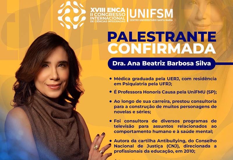 A palestra de abertura será com a Dra. Ana Beatriz Barbosa Silva, uma das maiores referências em saúde mental da América Latina que estará em Cajazeiras para compartilhar conhecimento, reflexões e experiências transformadoras no ENCA e no II Congresso Internacional de Ciências Integradas do UNIFSM.