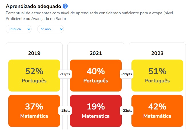 A cor verde foi ancorada na Meta 3 do “Todos Pela Educação”, de que 70% dos alunos deveriam apresentar aprendizado adequado. A cor amarela, de que ainda se está um pouco abaixo desse percentual. Já a cor laranja, na visão de que é insucesso se menos de 50% dos alunos demonstram aprendizado adequado. Por fim, a cor vermelha ilustra que a grande maioria dos alunos não apresenta um bom nível de aprendizagem.
