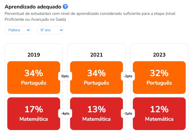 9º ANO – Cajazeiras também fica atrás, com 32% em Português e apenas 12% em Matemática. Sousa surge com 38% em Português e 17% em Matemática. Patos alcança 33% em Português e 16% em Matemática.