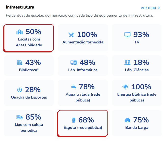 Nos dados de infraestrutura (Anuário da Educação Básica 2024), 100% das escolas públicas municipais de Cajazeiras têm alimentação e energia elétrica. Porém, 78% usufrui de água tratada; 68% conta com rede de esgoto e 85% tem coleta periódica de lixo.