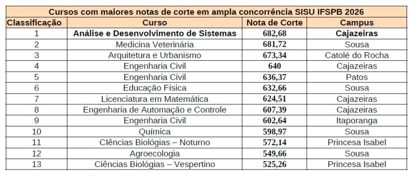 Completam a lista: Engenharia Civil (640) de Cajazeiras; Engenharia Civil (636,37) de Patos; Educação Física (632,66) de Sousa; Licenciatura em Matemática (624,51) de Cajazeiras; Engenharia de Automação e Controle (607,39) de Cajazeiras; Engenharia Civil (602,64) de Itaporanga; Química (598,97) de Sousa; CIências Biológias – Noturno (572,14) de Princesa Isabel; Agroecologia (549,66) de Sousa; e Ciências Biológias – Vespertino (525,26) de Princesa Isabel.