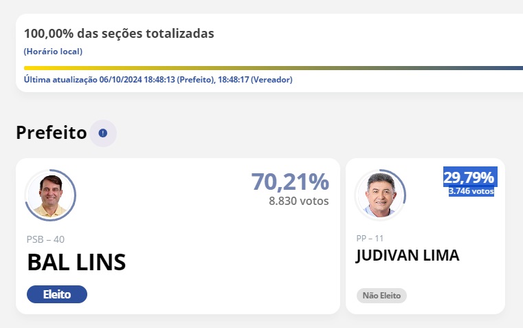 O prefeito Bal Lins, do PSB, foi eleito para mais quatro anos de mandato no município São José de Piranhas, no Sertão da Paraíba. Com 100% das urnas apuradas neste domingo (6), Bal ficou com 8.830 votos (70,21%) contra 3.746 votos (29,79%) de Judivan Lima (Progressista).