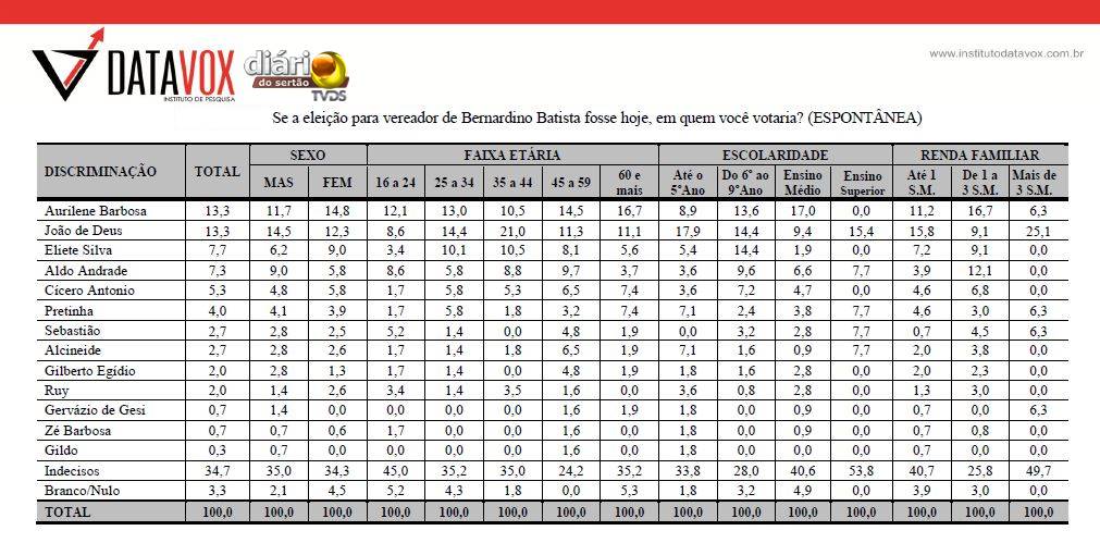 O Sistema Diário de Comunicação, em parceria com o Instituto Datavox, apresentou os primeiros números da pesquisa estimulada para vereador em Bernardino Batista, município da região de Cajazeiras, no Sertão do estado, com os nomes colocados como pré-candidatos à disputa. Os dados foram divulgados nesta sexta-feira (14) durante o programa Olho Vivo, da TV Diário do Sertão e Rede Diário de Rádios, apresentado pelos radialistas Petson Santos, José Dias Neto e Jota França. O atual vereador Aurilene Barbosa, do PSB, é o mais lembrado pela população.