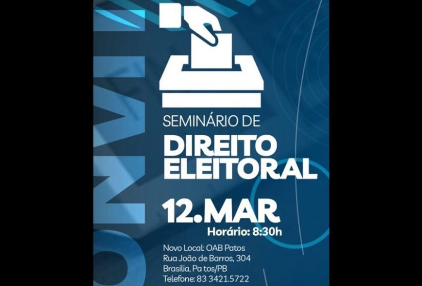 Com vagas esgotadas, terá início nesta quinta-feira (12) na cidade de Patos, no Sertão do estado, o Seminário de Direito Eleitoral promovido pelo escritório Geilson Salomão Advogados Associados, que passa a atuar nas áreas de Direito Eleitoral e Partidário com foco para eleições de Prefeitos e Vereadores.
