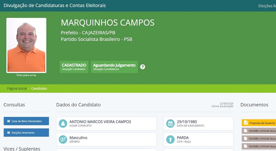 Os cadastros das candidaturas de Marquinhos Campos e de seu vice Chico de Bianor foram ao ar no site do TSE nesta terça-feira (22)
