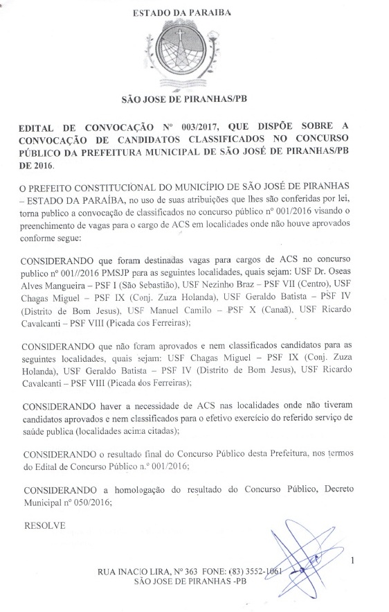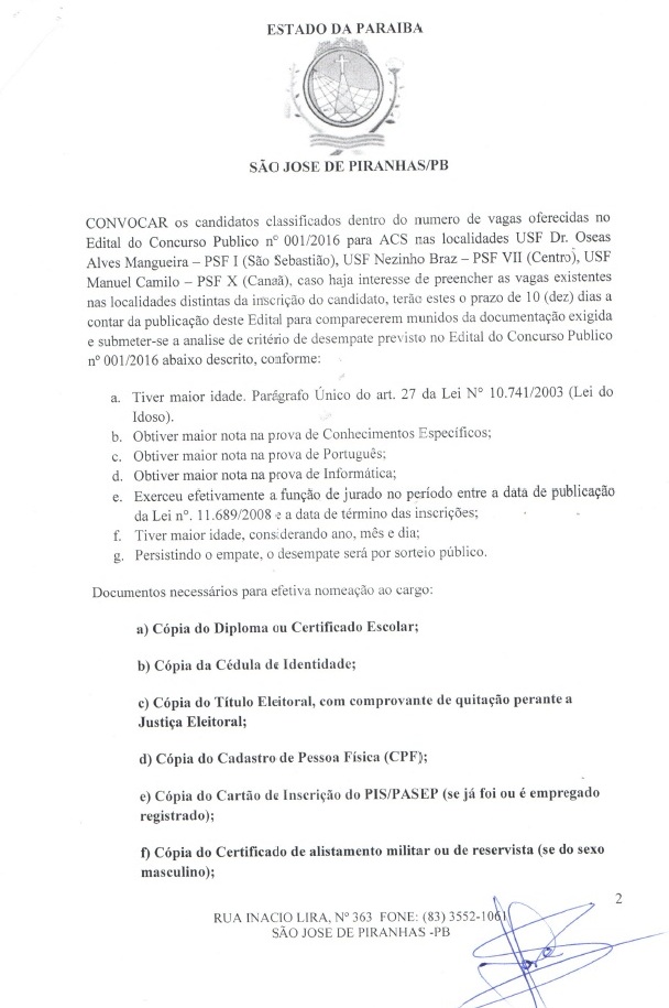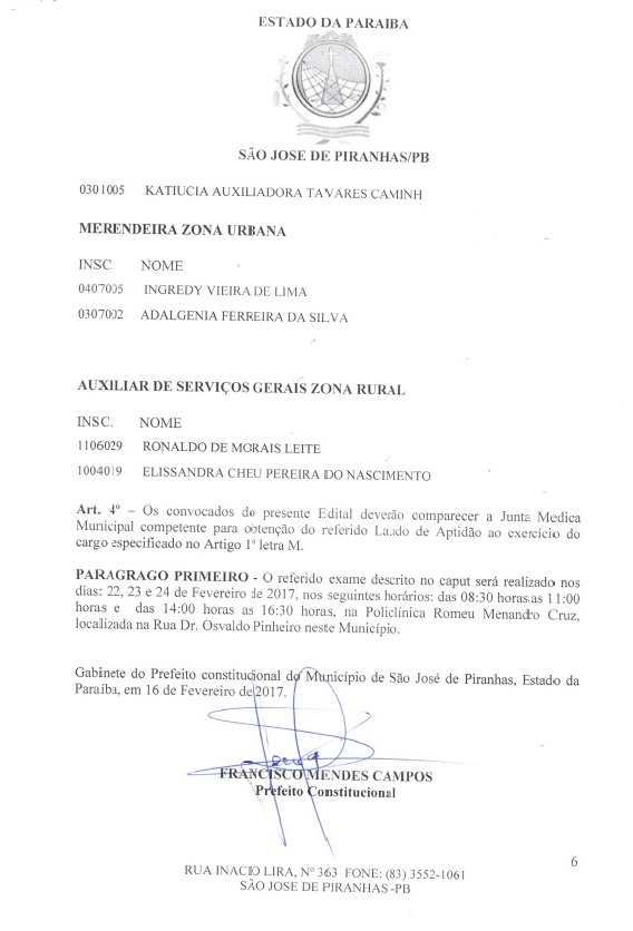 Após convocar aprovados, prefeito de São José de Piranhas convoca classificados no concurso. LISTA!