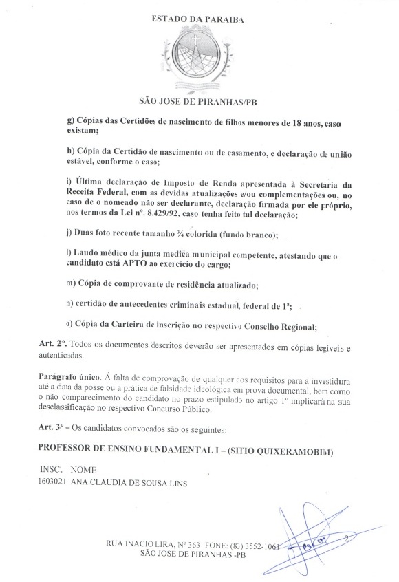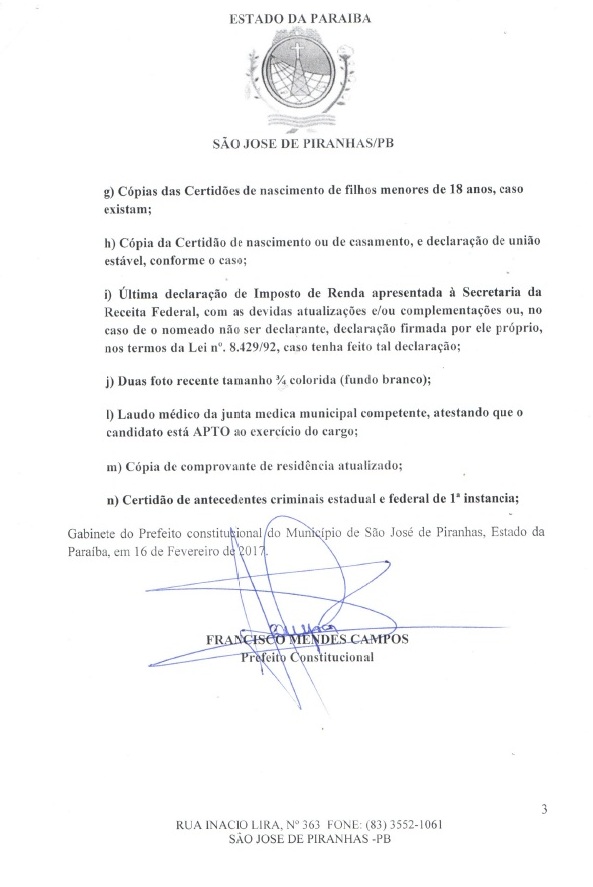 + Prefeitura de São José de Piranhas convoca mais 35 concursados para assumir cargos públicos. LISTA!