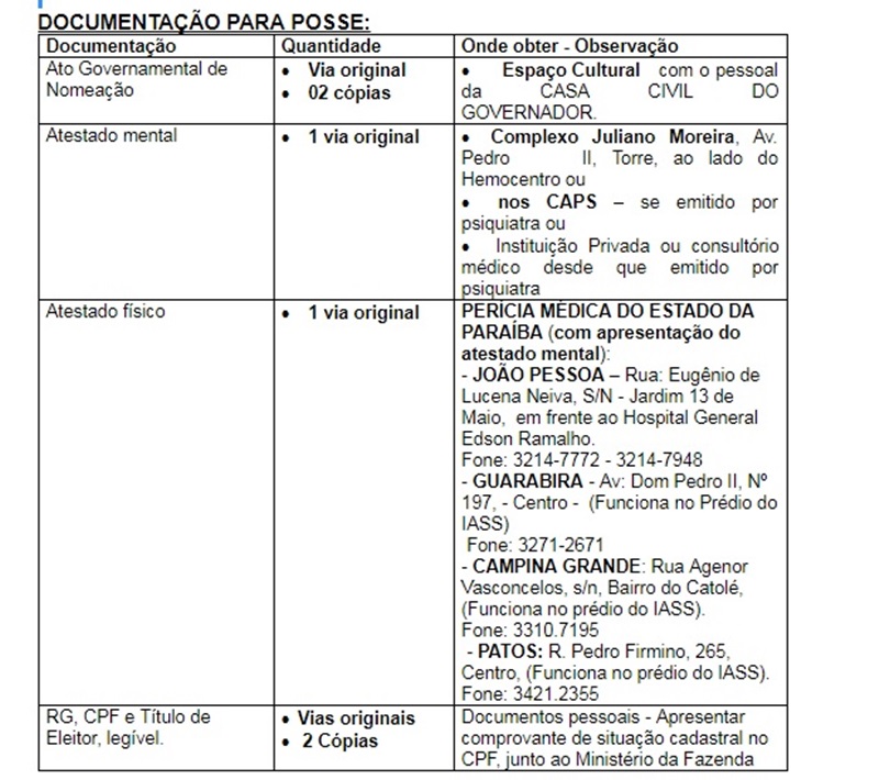 Segundo o cronograma final do certame, a cerimônia de posse coletiva dos candidatos aprovados está prevista para acontecer no dia 5 de fevereiro, no Espaço Cultural, em João Pessoa. A posse individual com a entrega dos documentos será feita até o dia 9 de fevereiro, também no Espaço Cultural. Após essa data, os candidatos que não tenham tomado posse devem procurar a Gerência de Posse, no Centro Administrativo Estadual, em Jaguaribe, com os documentos exigidos.