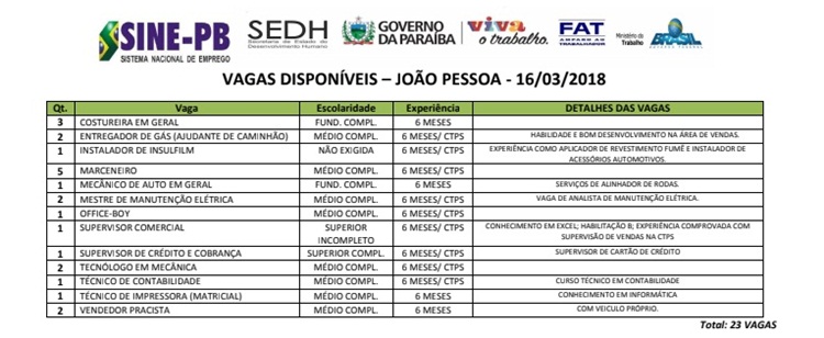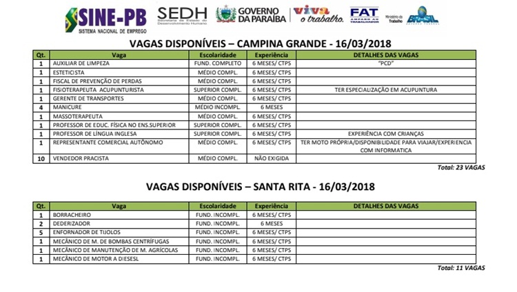 O Sistema Nacional de Empregos da Paraíba (Sine-PB) oferece, a partir da próxima semana, 58 oportunidades de emprego, das quais 23 em João Pessoa e outras 23 em Campina Grande. As demais vagas estão distribuídas nas cidades de Cabedelo e Santa Rita. O maior número de vagas é para vendedor pracista e marceneiro. São 10 oportunidades para a primeira função, ofertadas em João Pessoa. Já para a segunda, são cinco, em Campina Grande.