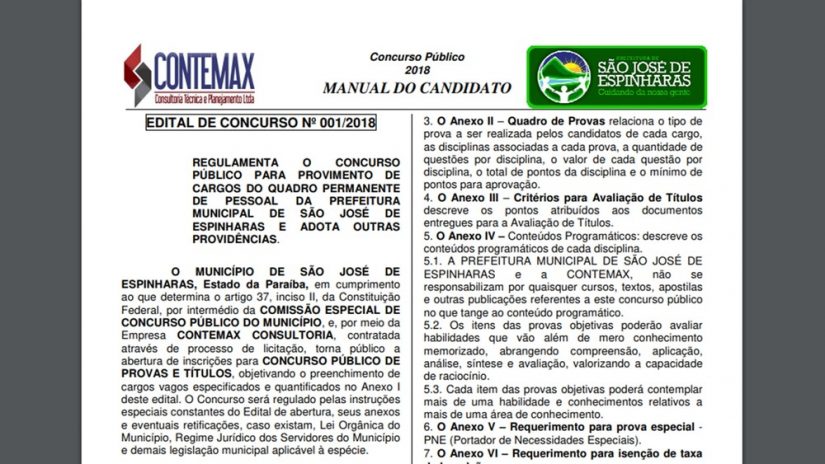 A Prefeitura de São José de Espinharas também tem um edital de concurso público aberto, mas as inscrições para esse seguem abertas até o dia 28 de outubro. Para o concurso estão previstas 22 vagas para cargos de todos os níveis de escolaridade.