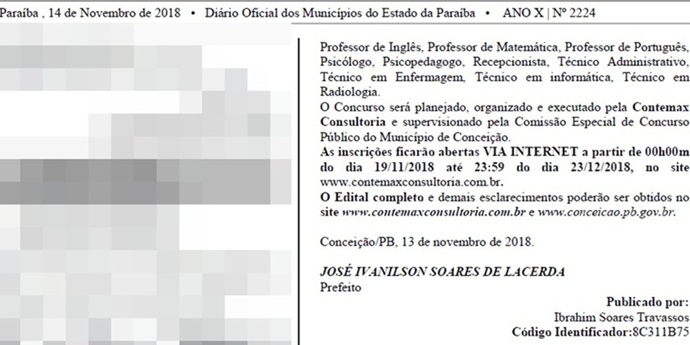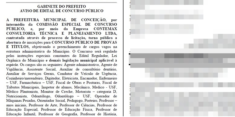 A prefeitura de Conceição, Sertão da Paraíba divulgou no Diário Oficial dos Municípios desta quarta-feira (14), as vagas e datas para inscrições no novo concurso público que será realizado no município.