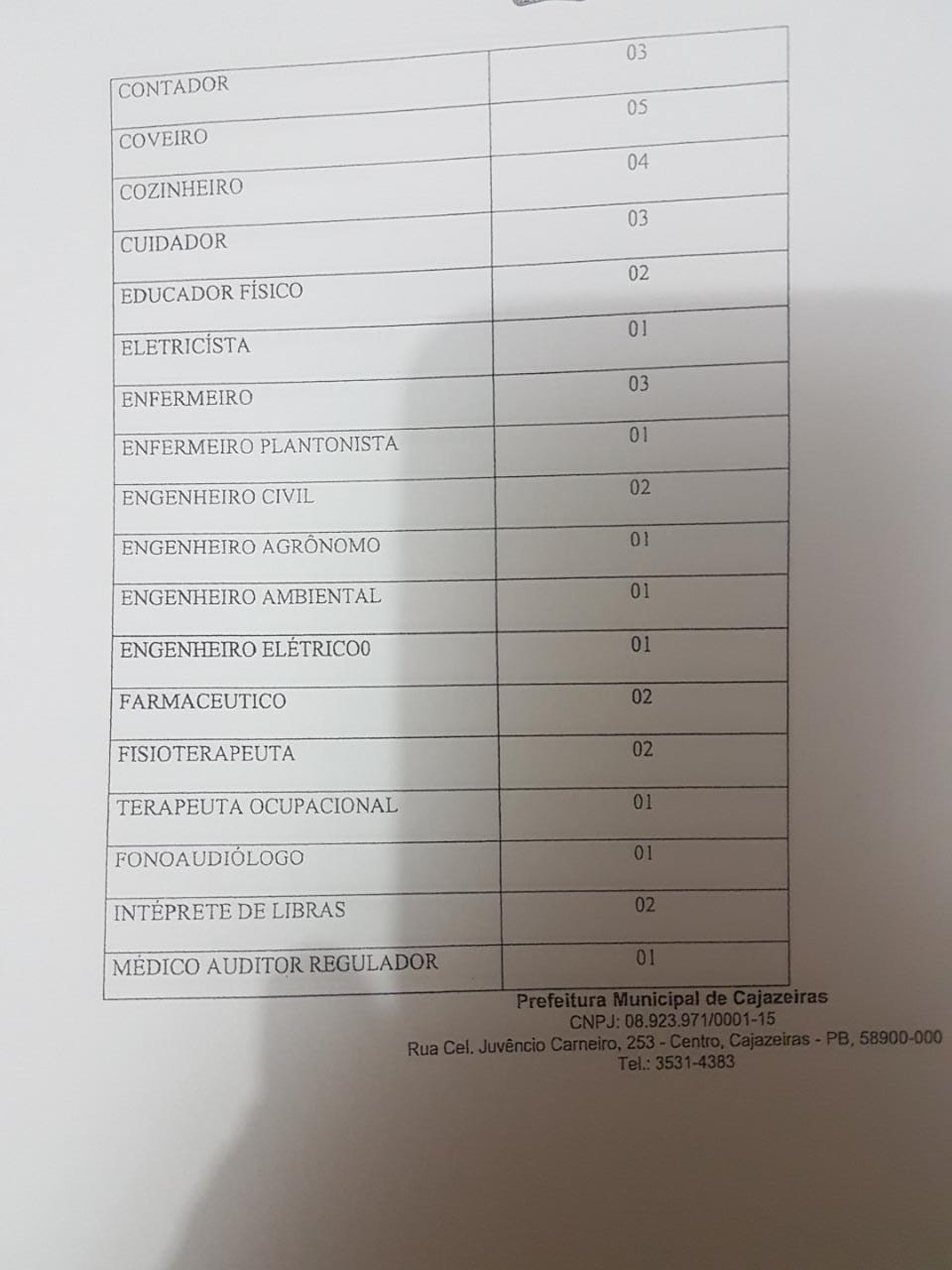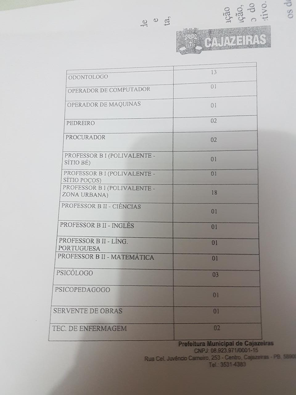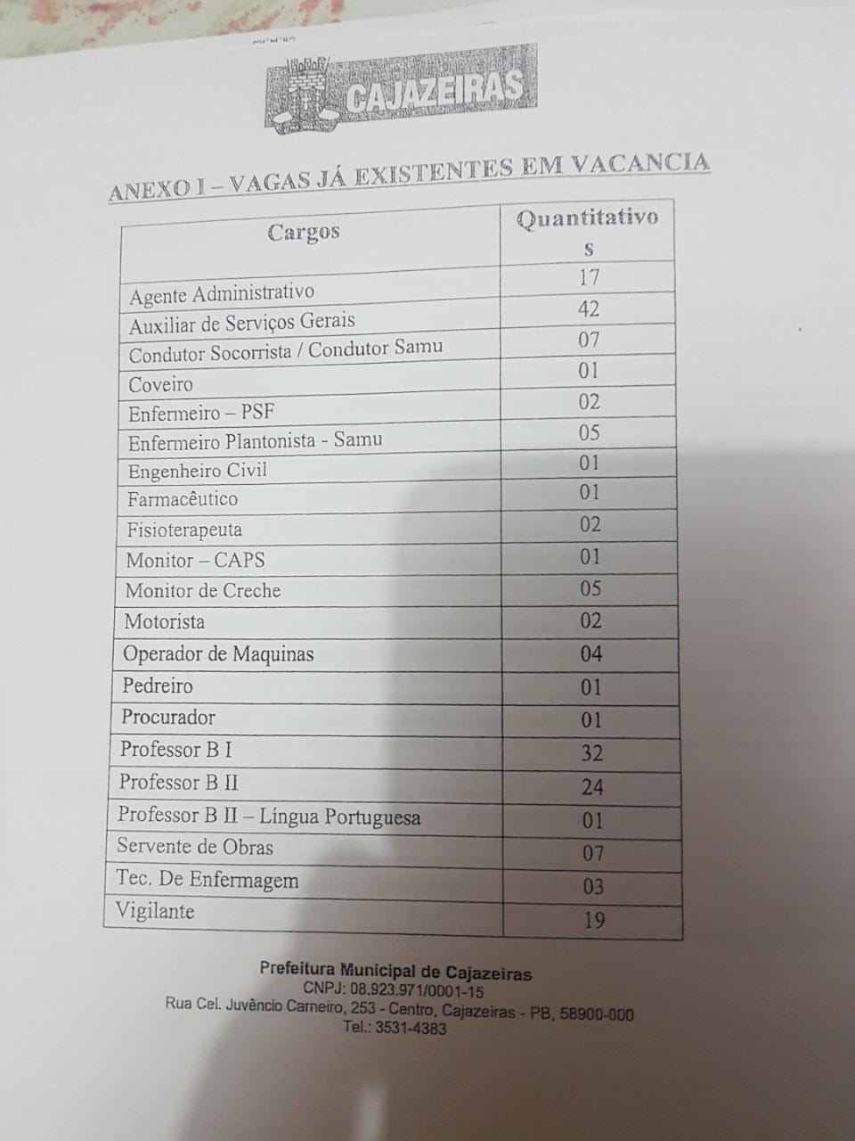 Após levantamento feito das vagas em vacância, e a necessidade de se criar novas funções, serão definidos o número de vagas a ser oferecido pelo certame em várias áreas, conforme a necessidade atual do executivo cajazeirense.