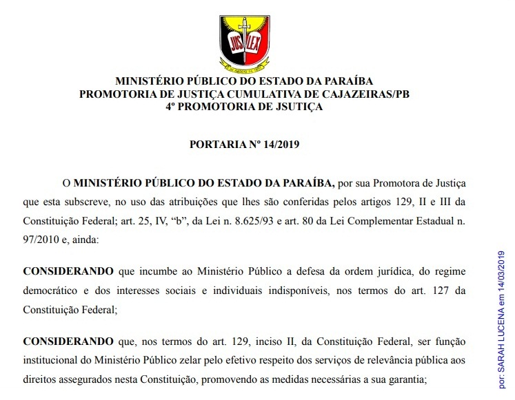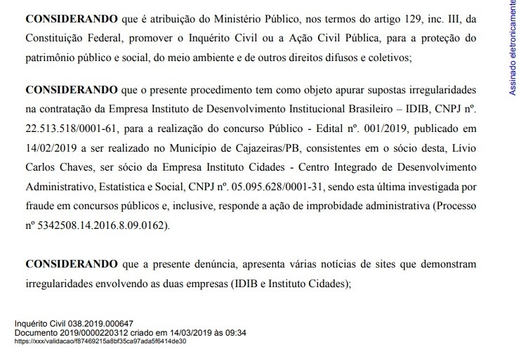 A Portaria Nº 14/2019 ao qual o Diário do Sertão teve acesso diz que “a presente denúncia apresenta várias notícias de sites que demonstram irregularidades envolvendo as duas empresas (IDIB e Instituto Cidades)”.