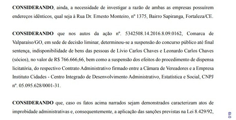 A Portaria assinada pela promotora de justiça Sarah Araújo Viana de Lucena diz ainda que na ação contra o Centro Integrado de Desenvolvimento Administrativo, Estatística e Social determinou-se a suspensão do concurso público em Valparaíso/GO.
