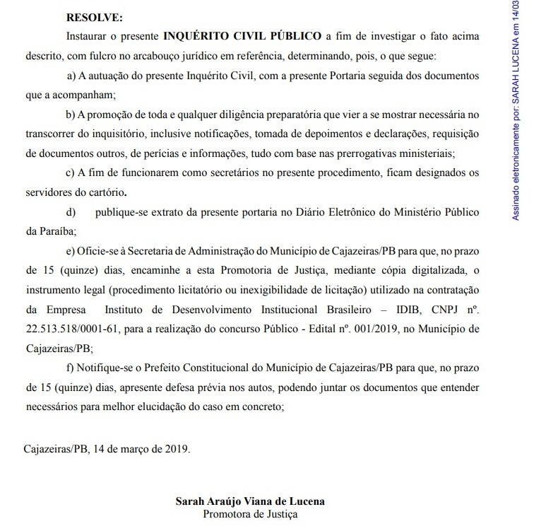 O Ministério Público da Paraíba (MPPB) instaurou um inquérito para apurar supostas irregularidades na contratação do Instituto de Desenvolvimento Institucional Brasileiro – IDIB, empresa responsável pela realização do concurso público da Prefeitura de Cajazeiras que está marcado para o dia 09 de junho.