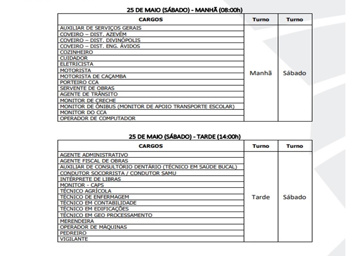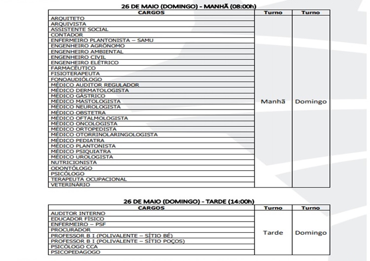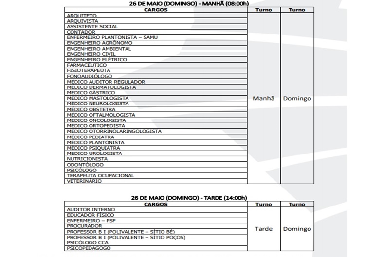 As provas serão aplicadas em dois turnos, manhã e tarde, dependendo do cargo oferecido.
