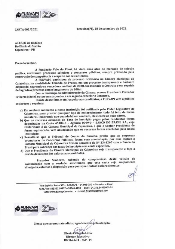 Na tarde desta terça-feira (28), após divulgação da carta, em contato telefônico com o Diário do Sertão, o vereador Eriberto Maciel, presidente da Câmara de Cajazeiras disse que está cumprindo agenda administrativa em Brasília-DF e que ao retornar fará procedimento administrativo de comunicado à FUNVAPI sobre concurso público e finalização dos detalhes.