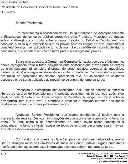 A Consultoria Técnica e Planejamento LTDA (Contemax) responsável pela realização do Concurso Público de Sousa divulgou nota na manhã desta segunda-feira (11), informando nova data de realizações das provas para os candidatos que não conseguiram realizar o certame.