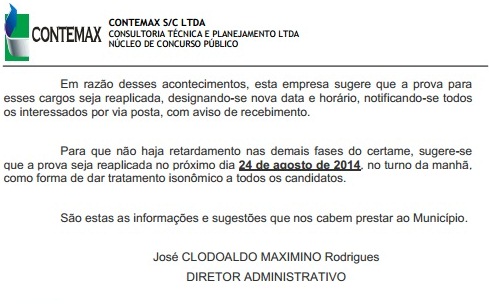Ainda de acordo com a Contemax, o problema de horário nos cartões de inscrições dos candidatos ocorreu após uma falha no sistema operacional que em vez de selecionar as unidades escolares onde seriam aplicadas as provas, acabou selecionando o turno da tarde.