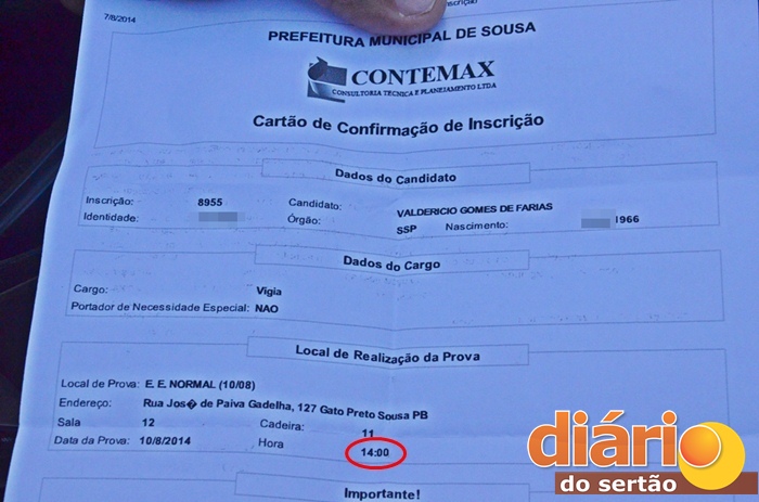 O candidato Valderício Gomes de Farias (foto abaixo) pretendia concorrer ao cargo de vigia, mas não fez o concurso. No cartão de inscrição a prova estava marcada para acontecer às 14h, porém ao chegar no local de aplicação do exame ficou sabendo que as provas haviam sido aplicadas às 08h.