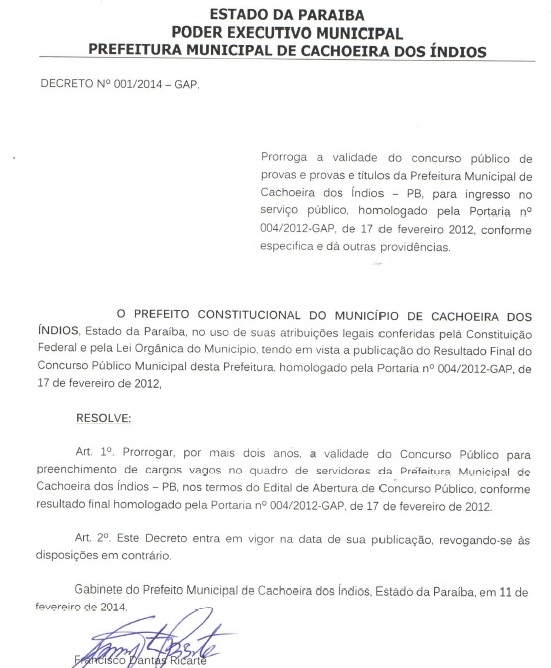 O prefeito da cidade de Cachoeira dos Índios, região de Cajazeiras, Francisco Ricarte (Bodim-DEM) prorrogou por mais dois anos a validade do concurso público do município realizado no ano de 2012.