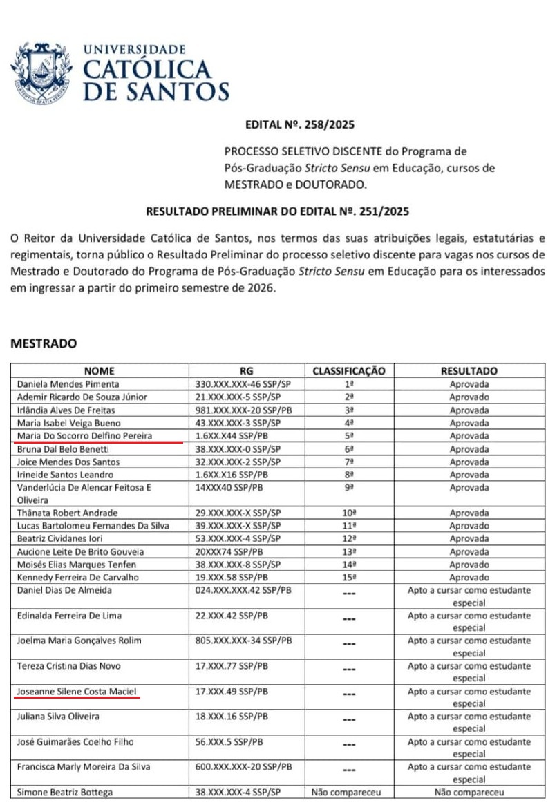 A insatisfação dos discentes aumentou quando eles viram que nessa lista preliminar da UNISANTOS aparecem os nomes da prefeita Socorro Delfino (aprovada na 5ª colocação), da secretária municipal de Educação Joseanne Maciel (apta a cursar como estudante especial) e outros professores que, segundo Felipe e Aparecida, são servidores da pasta da Educação de Cajazeiras (clique aqui e acesse a lista).