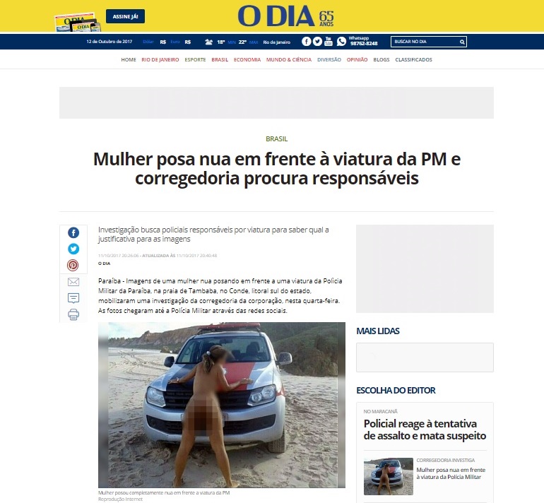 A foto de uma mulher totalmente nua que posou em viatura da Polícia Militar da Paraíba viralizou nas redes sociais e o fato repercutiu nacionalmente. Nesta quinta-feira a foto da peladona foi parar no noticioso O Dia, que tem circulação nacional e está entre os mais acessados do Brasil.