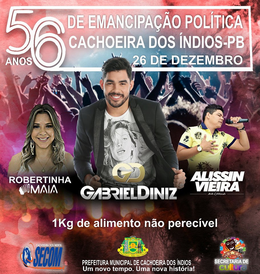 De acordo com a programação, três atrações vão animar o dia 26 (terça-feira) de Cachoeira dos Índios, são elas: Robertinha Maia, Gabriel Diniz e Alissin Vieira.