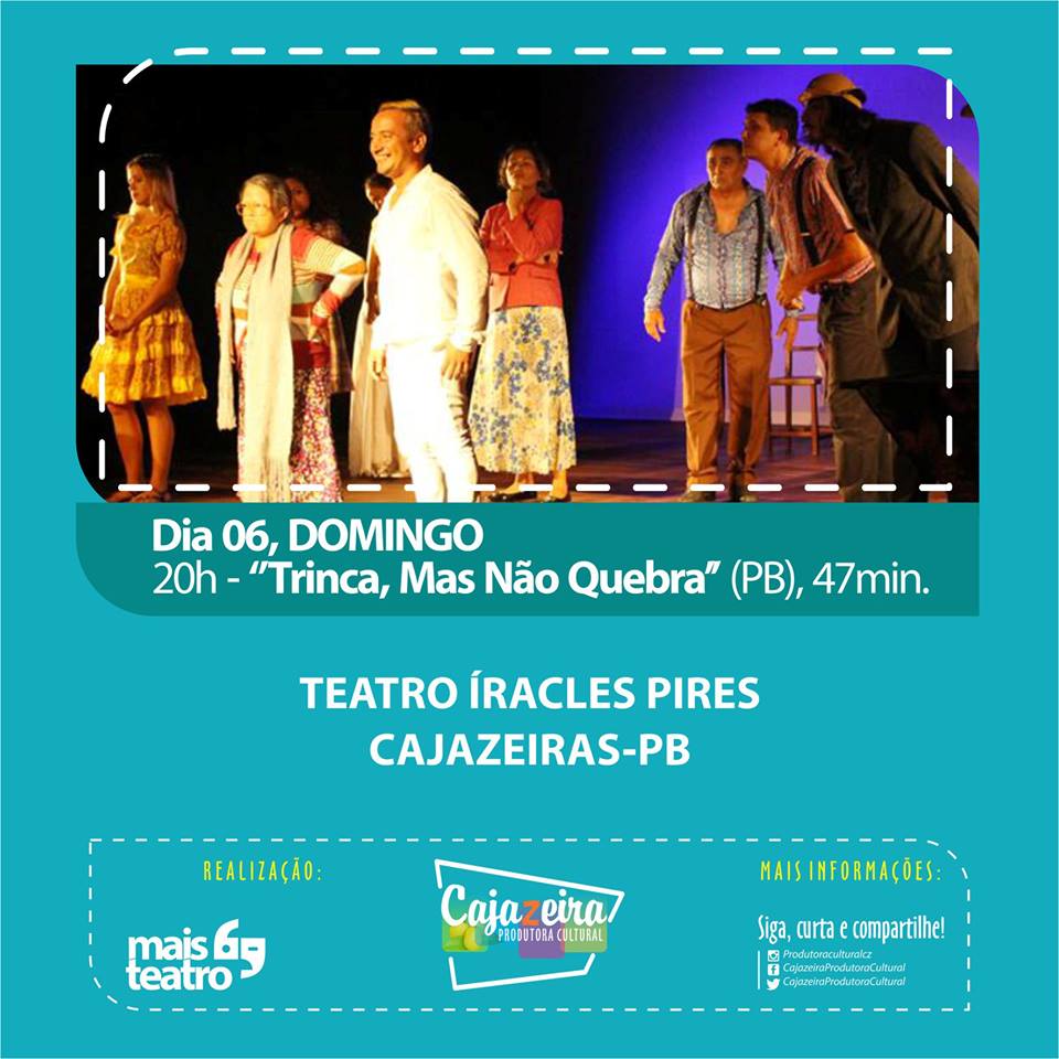 Já no dia 6, será a vez de “Trinca, mas não quebra”, que tem texto de Eliezer Rolim e direção de Francisco Hernandez. A peça é, na verdade, é uma festa de casamento na noite de Santo Antônio no interior do Sertão nordestino, mesclando superstições e recordações lúdicas dos fogos de artifícios nas amarras de uma desesperada paixão entre dois adolescentes. A peça é um drama de fogueira no sítio Umburanas, quando Terezinha, uma noiva de 15 anos, descobre morrer de amor por seu ex-namorado que se faz penetra para resgatar publicamente o sentimento que o sufoca, criando uma colagem de danças folclóricas e folguedos da cultura popular.