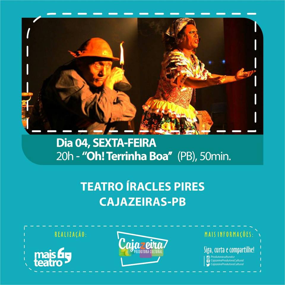 No dia 4 de maio, uma sexta-feira, sobe ao palco do Teatro Íracles Pires o espetáculo “Oh! Terrinha Boa!”, com texto e direção do Coletivo (Jucinério Fêlix e Ricardo Lacerda). A peça é uma comédia que retrata a saga de uma família de nordestinos sertanejos que diante das dificuldades naturais imposta pela seca, o latifúndio e o poder político dos coronéis é forçada a deixar sua terra de origem e partir rumo a cidade de São Paulo na busca desesperada por melhores condições de vida. A dificuldade de moradia e emprego, bem como a adaptação ao grande centro, passa humilhação por não acompanhar a tal modernidade, por exemplo: andar de escada rolante, obedecer à sinalização do trânsito na qualidade de pedestre, esta família acaba dividindo com os moradores de rua um espaço debaixo de viadutos. Os temas básicos deste espetáculo são: Cultura Nordestina, Descriminação e Preconceito, Religiosidade e Êxodo Rural.