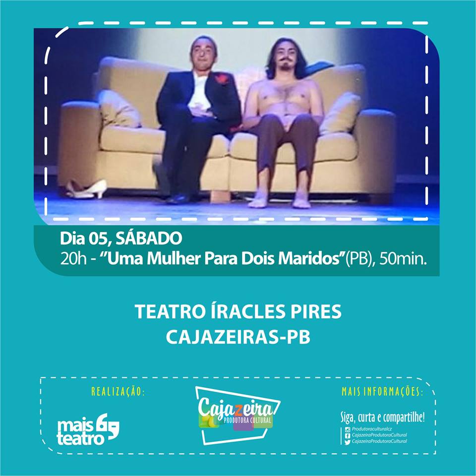 No dia 5, é a vez da peça “Uma mulher para Dois Maridos”, com texto de Eliseu Miranda e Campana e direção de Francisco Hernandez. O espetáculo conta a história de Oliva, uma jovem que se vê dividida entre o amor de dois homens, ou melhor, seus dois maridos. Há um ano, Olívia casou-se com Roberto e na noite de núpcias o mesmo caiu do navio em que viajavam antes da consumação da lua de mel. Olívia, desesperada, desiludida, consola-se nos braços de Arnaldo, seu amigo, por quem acaba se apaixonando e após um ano resolve casar-se novamente. Ao chegar em casa, após o casamento, os dois têm uma grande surpresa: Roberto está de volta! A partir desse inesperado reencontro o público irá se deparar com situações hilárias, pois os “dois maridos” passam a disputar a tão sonhada noite de amor com Olívia.