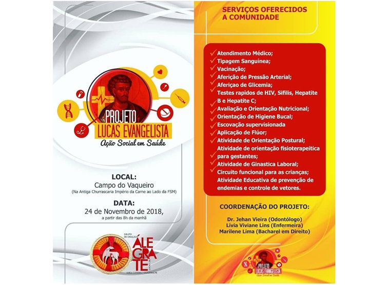 O Grupo de Oração ÁLEGRATE da Igreja Catedral, realiza na manhã deste dia 24 (Sábado) de Novembro no bairro Campo do Vaqueiro, a primeira edição do PROJETO LUCAS EVANGELISTAS: ação social em saúde.