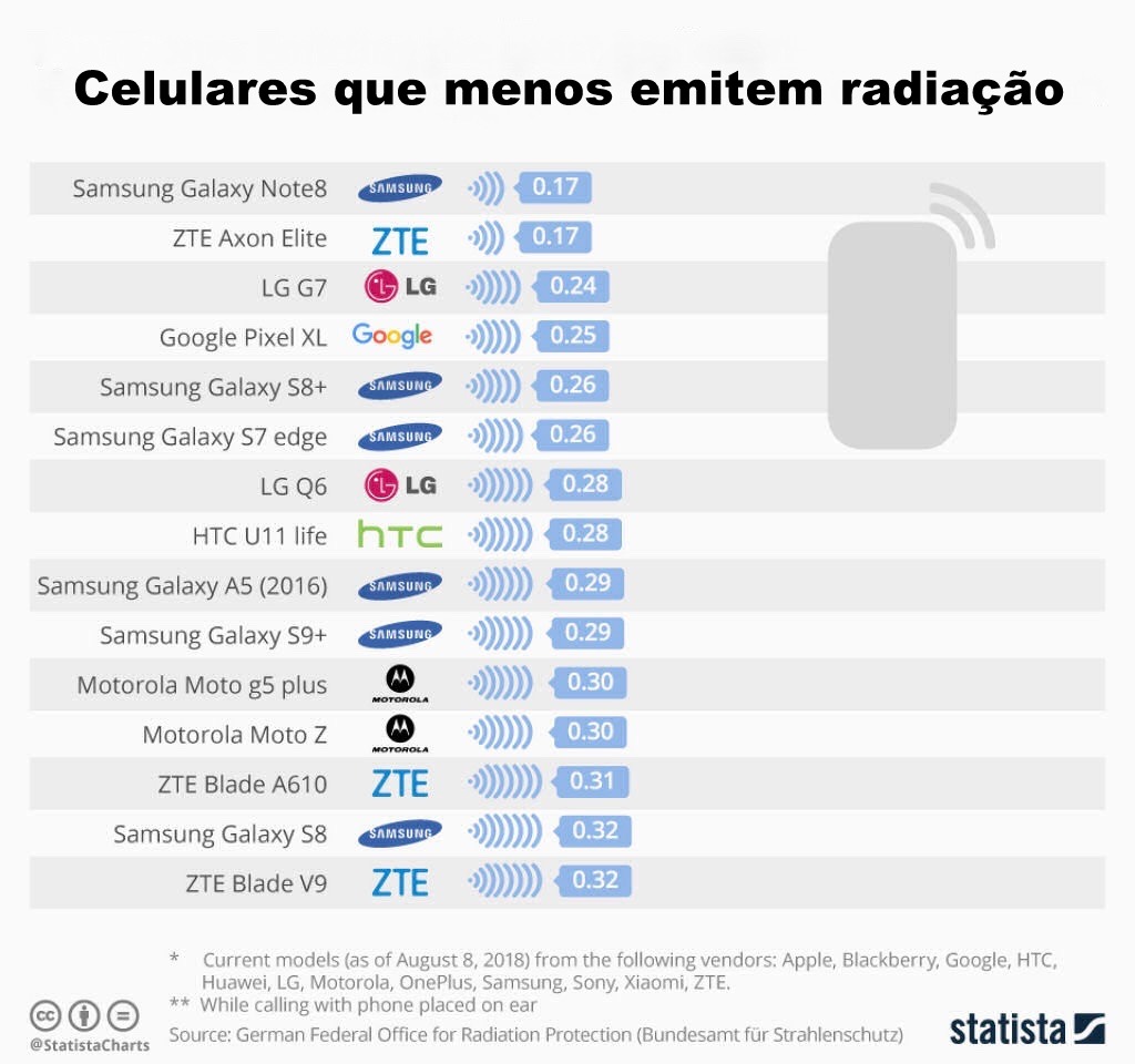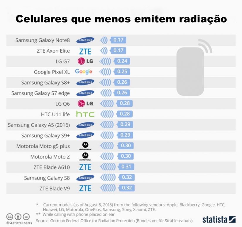 “Statista”, portal alemão de estatísticas, publicou em agosto uma lista com 15 modelos de celular que mais emitem radiação e outra lista com os 15 que menos emitem.
